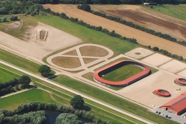 Für das Aufwärmtraining der Pferde stehen mehrere Führanlagen, 2 Trabzirkel sowie eine 250 Meter lange überdachte Reitbahn zur Verfügung.